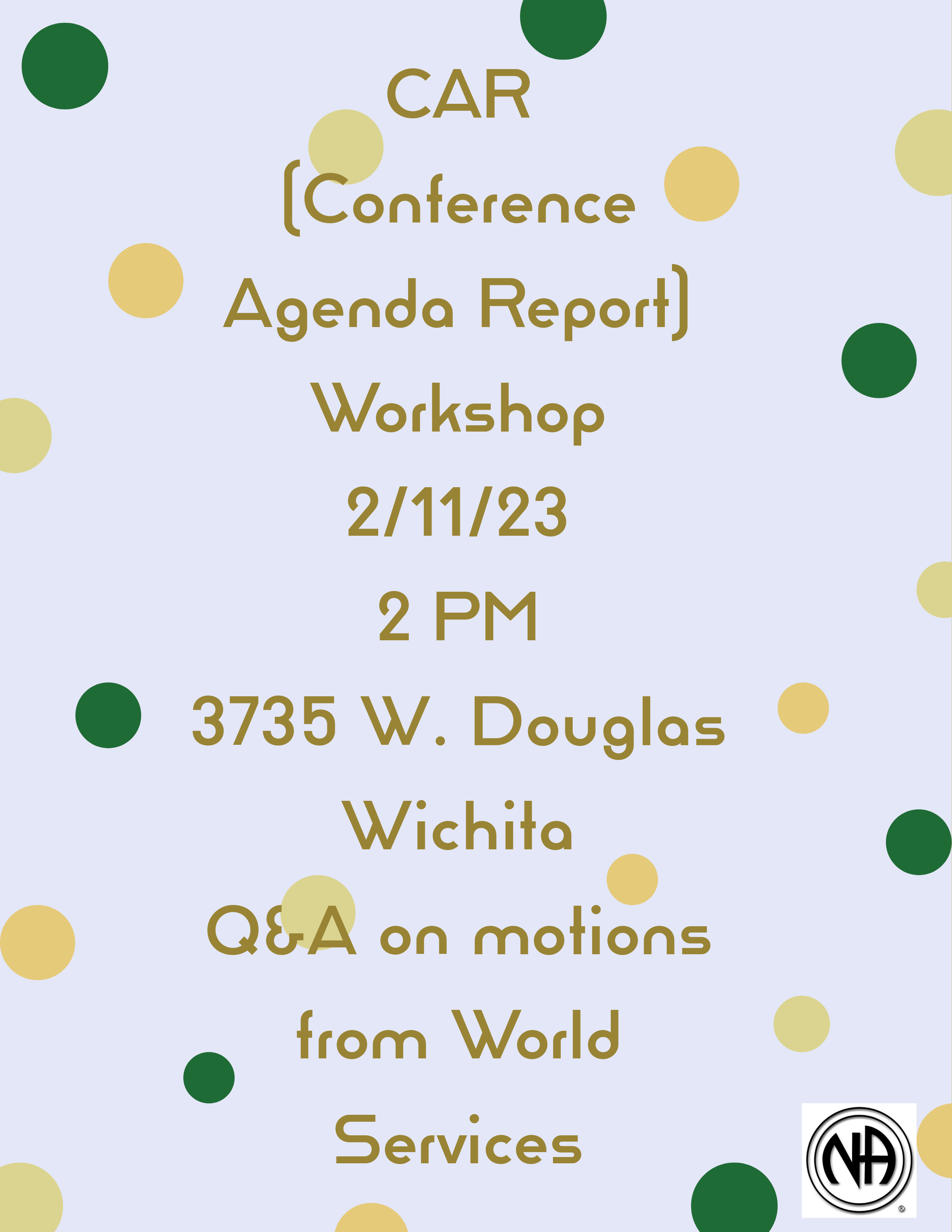 The Regional Service Committee (RSC) meets the third Saturday and Sunday in February, May, August, and November.  The RSC meetings are at 310 Swedonia St, Marquette, KS 67464.  Sub-committee meetings are held on Saturday, and the full RSC meets Sunday morning.